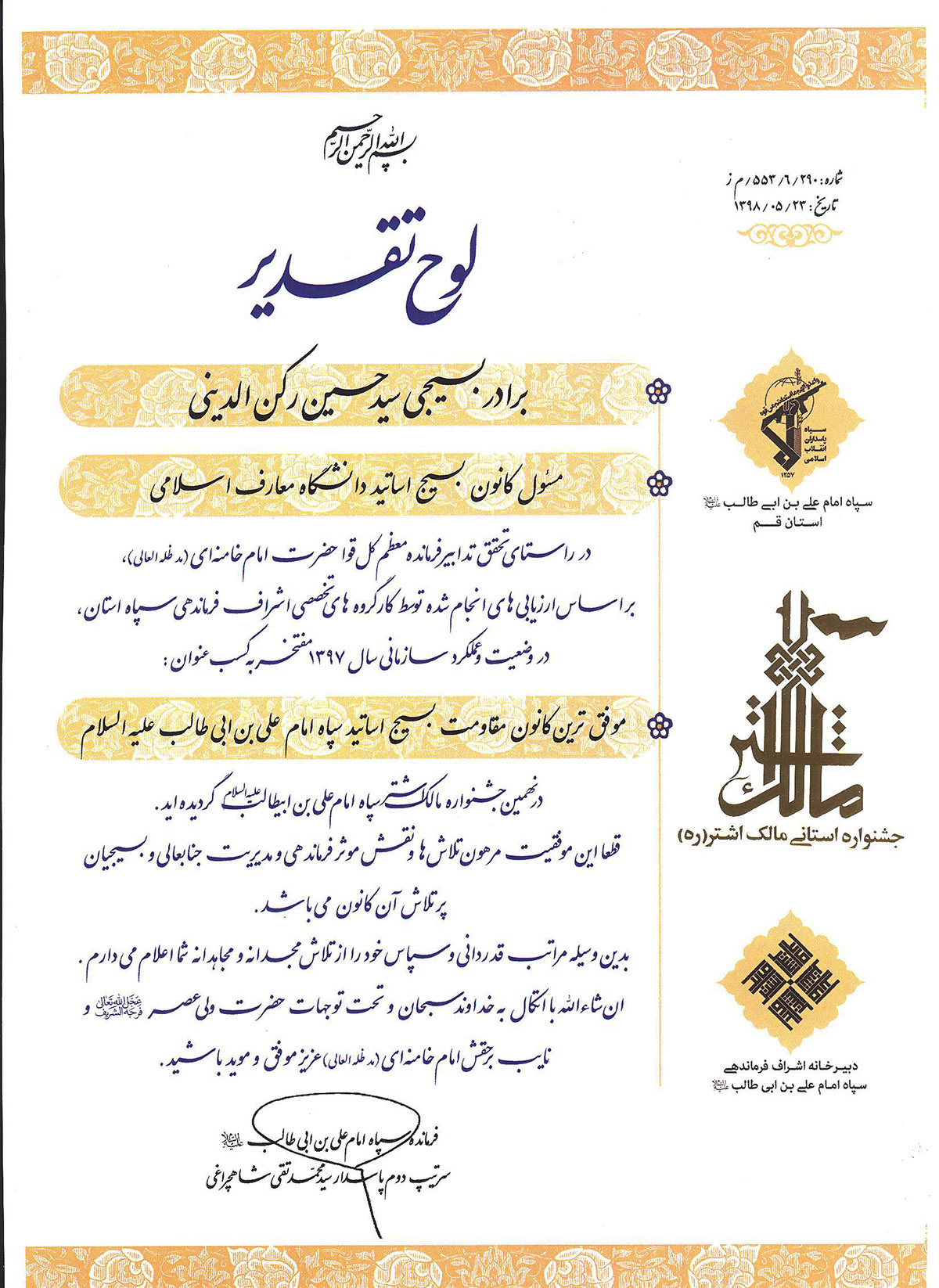 کانون بسیج اساتید دانشگاه معارف اسلامی در نهمین جشنواره مالک اشتر سپاه علی‌بن‌ابی‌طالب(ع) استان قم، به عنوان «موفق‌ترین کانون مقاومت بسیج اساتید سپاه علی‌بن‌ابی‌طالب(ع)» معرفی و در مراسمی که در روز چهارشنبه ۲۳ مردادماه ۹۸ برگزار گردید، از حجت الاسلام و المسلمین دکتر سید حسین رکن الدینی مسئول کانون بسیج اساتید دانشگاه تجلیل شد.