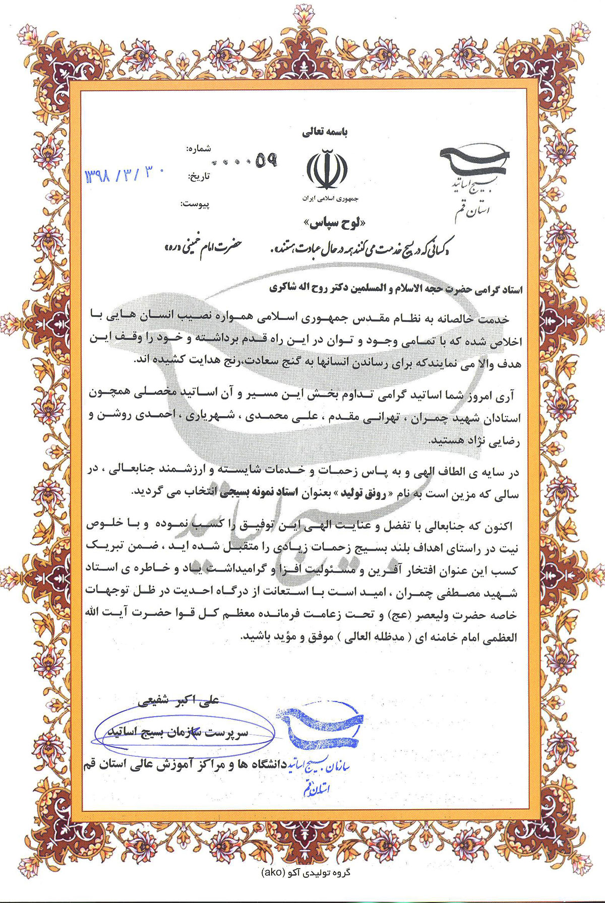 در پایان مراسم از اساتید نمونه تراز انقلاب اسلامی در بسیج اساتید استان قم به شرح ذیل تجلیل به عمل آمد: