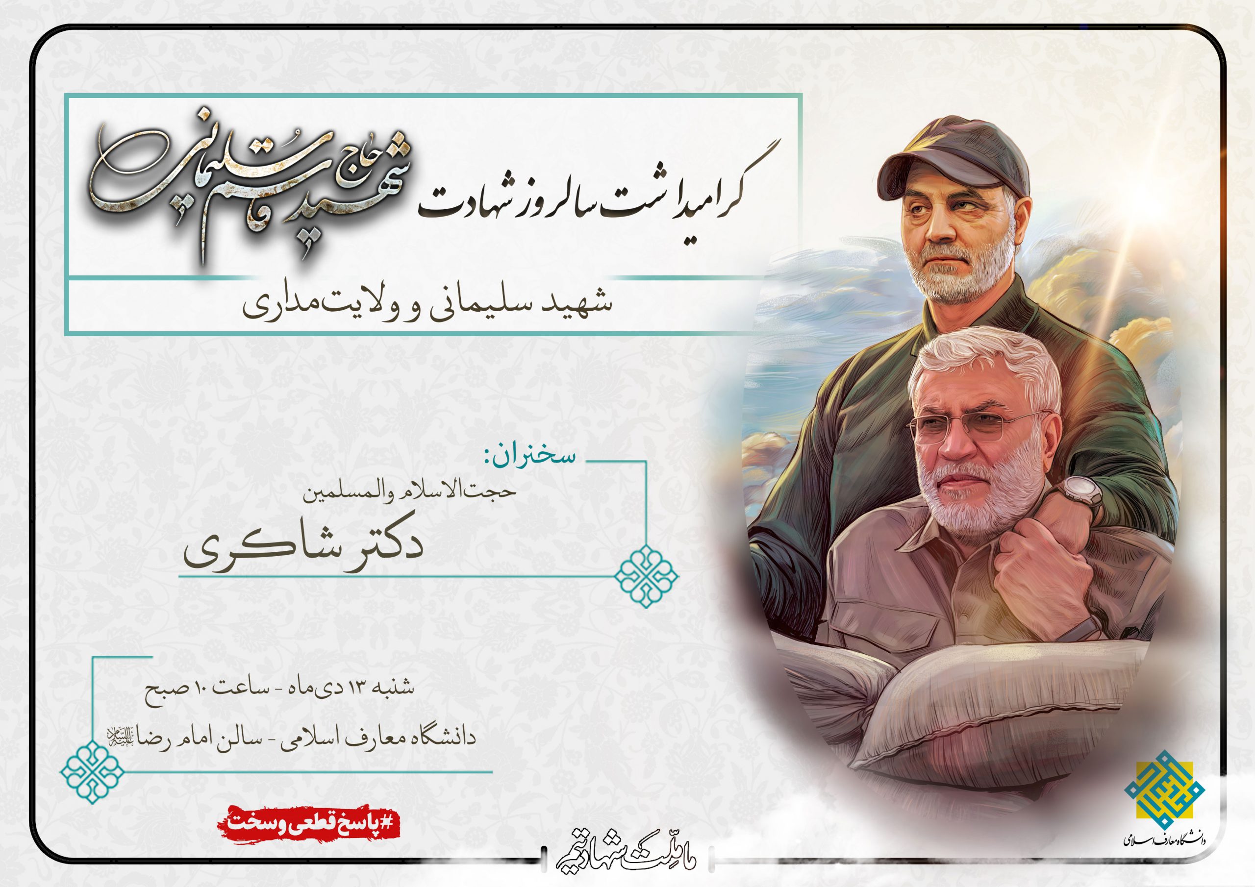مراسم گرامیداشت اولین سالگرد شهادت سپهبد شهید حاج قاسم سلیمانی با موضوع «شهید سلیمانی و ولایت‌مداری» با سخنرانی حجت‌الاسلام‌والمسلمین جناب آقای دکتر شاکری ریاست محترم دانشگاه معارف اسلامی در روز شنبه ۱۳ دی‌ماه ۱۳۹۹ ساعت ۱۰ صبح در سالن امام رضا(ع) برگزار می‌گردد.