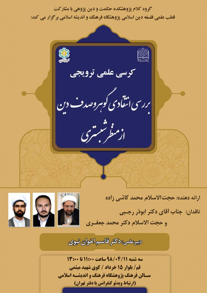سه شنبه, ۱۱ تیر, ۱۳۹۸کرسی علمی – ترویجی «بررسی انتقادی گوهر و صدف دین از منظر شبستری» توسط گروه کلام پژوهشکده حکمت و دینپژوهی با همکاری قطب علمی فلسفه دین اسلامی پژوهشگاه فرهنگ و اندیشه اسلامی برگزار خواهد شد.