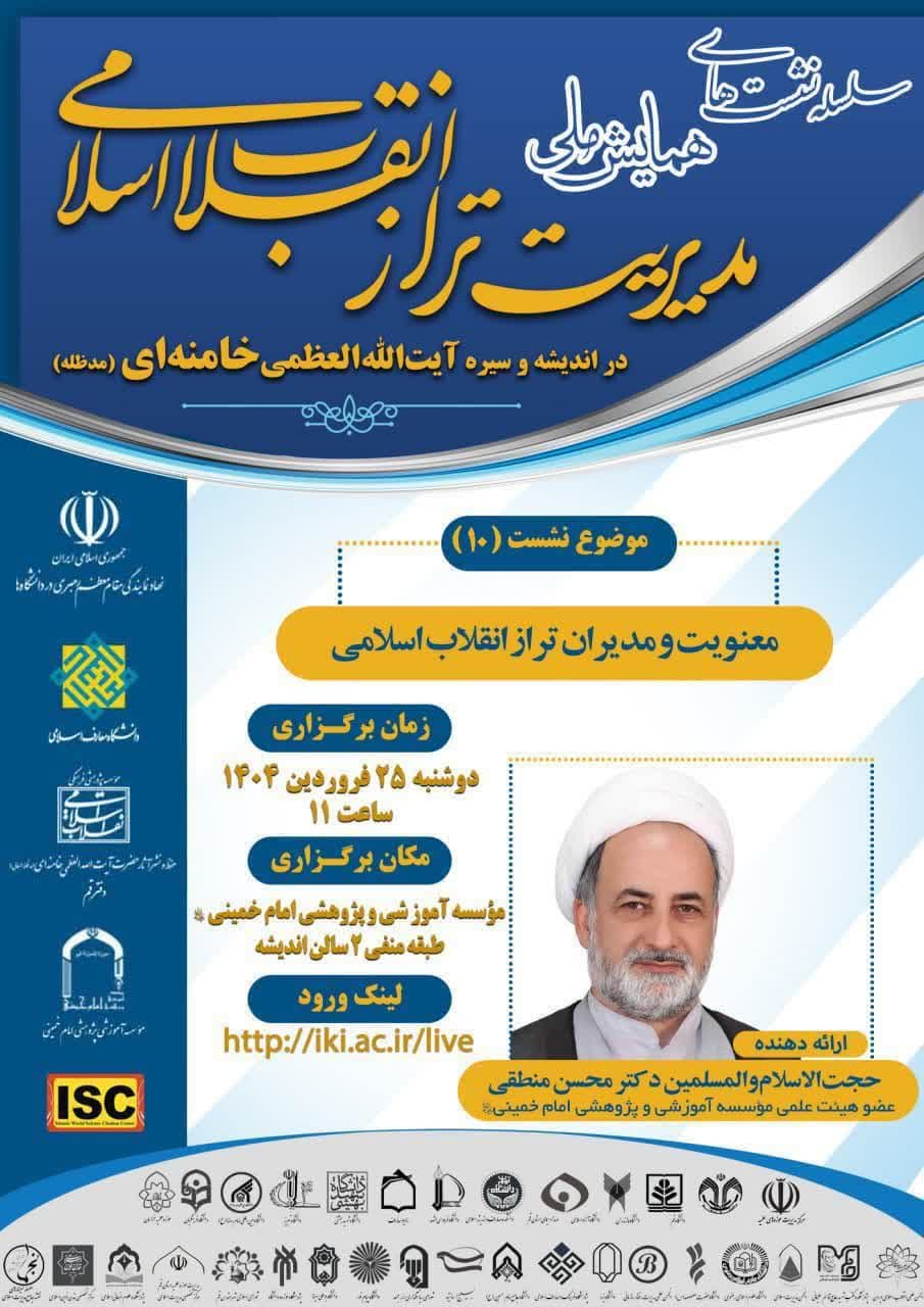 یکشنبه, ۲۴ فروردین, ۱۴۰۴دهمین پیشنشست همایش ملی “مدیریت تراز انقلاب اسلامی در اندیشه و سیره آیتالله العظمی خامنهای” به صورت حضوری و مجازی دوشنبه ۲۵ فروردین ۱۴۰۴ ساعت ۱۱ با ارائه حجتالاسلام والمسلمین دکتر منطقی دانشیار گروه مدیریت موسسه آموزشی و پژوهشی امام خمینی(ره) برگزار خواهد شد.