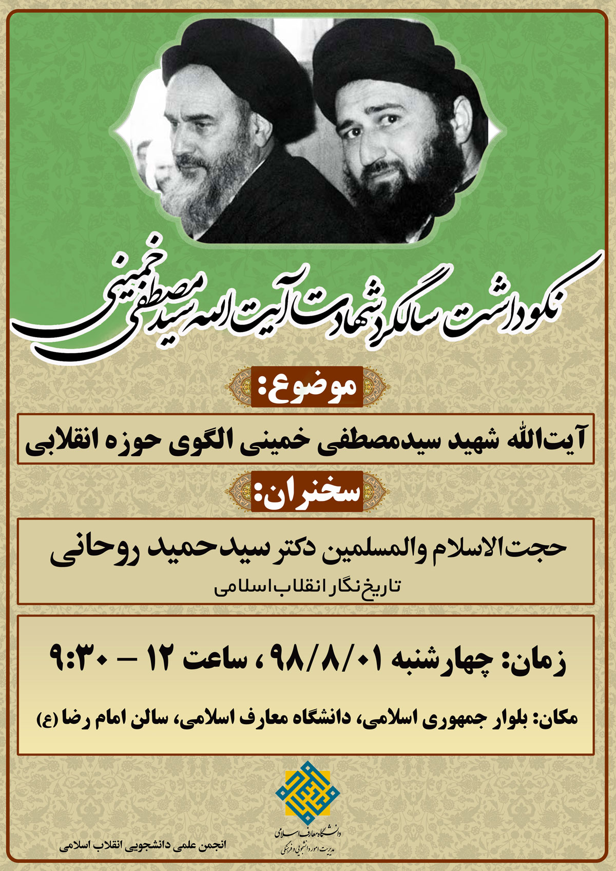 نشست «آیت الله شهید سید مصطفی خمینی الگوی حوزه انقلابی» با سخنرانی حجتالاسلام و المسلمین سید حمید روحانی (رئیس بنیاد تاریخ پژوهی و دانشنامه انقلاب اسلامی) روز چهارشنبه ۱ آبان ۹۸ از ساعت ۹:۳۰ تا ۱۲ در سالن امام رضا(ع) دانشگاه معارف اسلامی برگزار می گردد.
