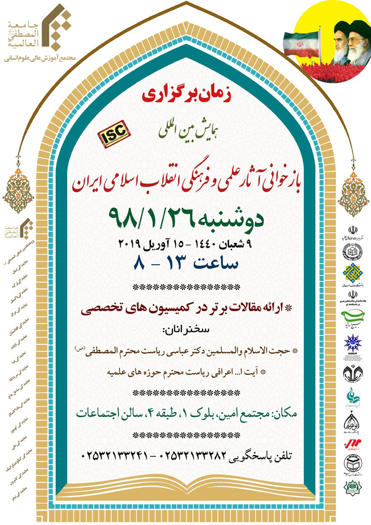 یکشنبه, ۲۵ فروردین, ۱۳۹۸همایش بینالمللی” بازخوانی آثار علمی و فرهنگی انقلاب اسلامی ایران” با مجوز وزارت علوم و ISC به همت مجتمع آموزش عالی علوم انسانی جامعهالمصطفی و با همکاری دانشگاه معارف اسلامی در تاریخ ۲۶ فرودین سال جاری برگزار میگردد.