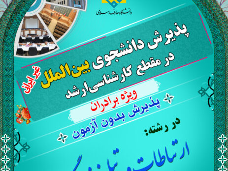 دانشگاه معارف اسلامی، برای سال تحصیلی ۱۴۰۵ ـ ۱۴۰۴ در رشته ارتباطات و تبلیغ فرهنگی (مقطع کارشناسیارشد)، دانشجوی بینالملل (غیر ایرانی) میپذیرد. مدارک مورد نیاز جهت ثبت نام اولیه: ۱. تکمیل فرم درخواست پذیرش؛ ۲. تصویر پاسپورت؛ ۳. تصویر عکس پرسنلی ۴*۳ جدید [...]