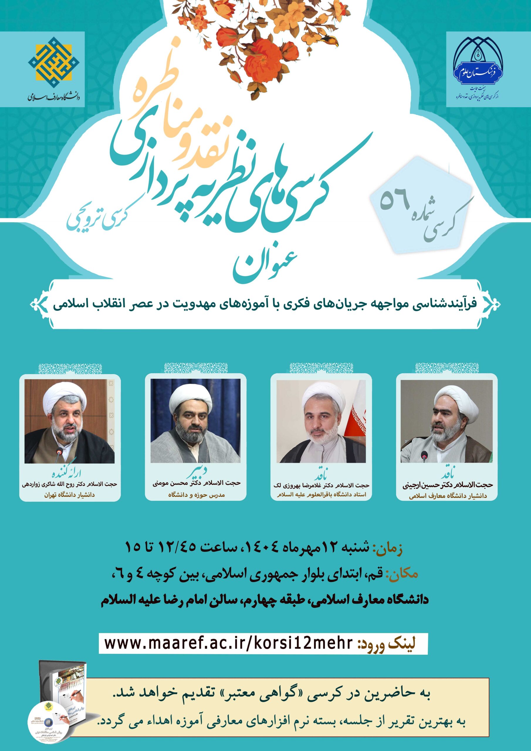 به همت معاونت پژوهشی دانشگاه معارف اسلامی پنجاه و ششمین کرسی علمی ترویجی با ارائه جناب آقای حجت الاسلام دکتر روح الله شاکری زواردهی (دانشیار دانشگاه تهران) و با عنوان «فرآیندشناسی مواجهه جریانهای فکری با آموزههای مهدویت در عصر انقلاب اسلامی » در تاریخ شنبه ۱۲ مهرماه ۱۴۰۴، ساعت ۴۵/۱۲ تا ۱۵ در سالن امام رضا علیه السلام دانشگاه معارف اسلامی برگزار میگردد.